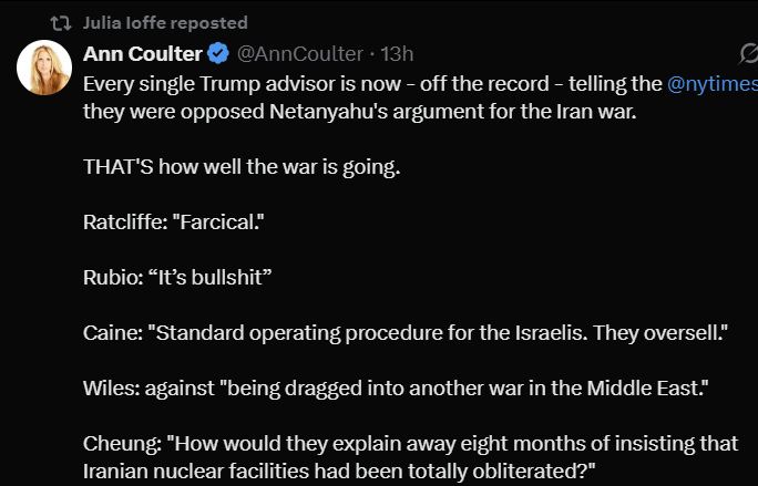 That was the NYT story about how the war started. How Trump got into it, in a version told obviously by JD Vance people, angling for Don the Don’s seat while Don is still alive. According to NYT, the most senior American military advisor, General Dan Caine described for Trump the Israeli con job, one they’d tried on other administrations before 47: “‘Sir, this is, in my experience, standard operating procedure for the Israelis. They oversell, and their plans are not always well-developed. They know they need us, and that’s why they’re hard-selling.’ Only Hegseth was a major supporter of the war.”