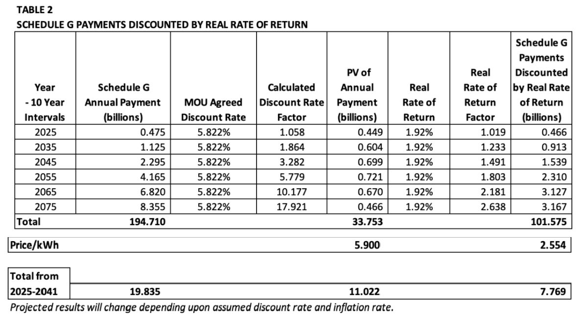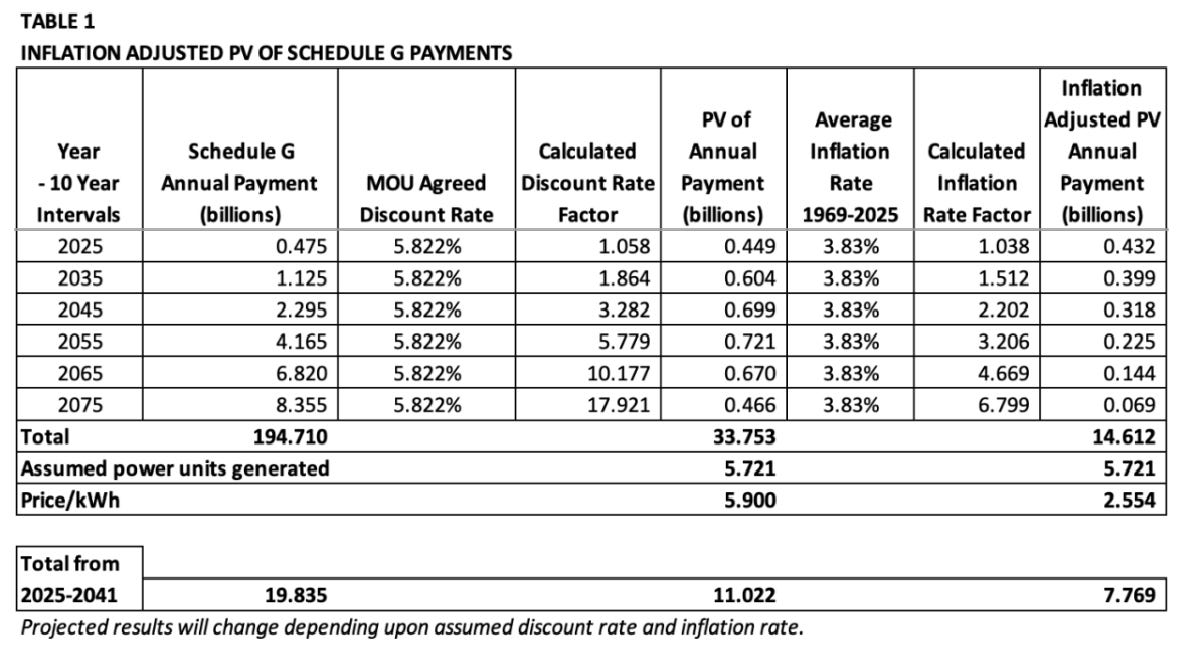 Table 1 below demonstrates how the average 5.9 cents per kWh (pv) over the term of the agreement gets ground down to 2.5 cents per kWh (pv) after adjusting for the average annual inflation rate since 1969 of 3.83%.
